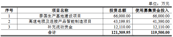 本次向特定对象发行股票拟募集资金总额不超过119,500.00万元(含本数),扣除发行费用后将全部用于泰国生产基地建设项目、高速电缆及连接产品智能制造项目、补充流动资金。